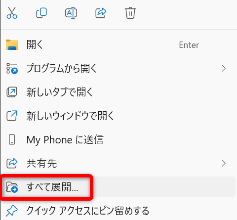 - ダウンロードしたZIPファイルを右クリック → 「すべて展開」または「展開」or「解凍」→「ここに解凍」