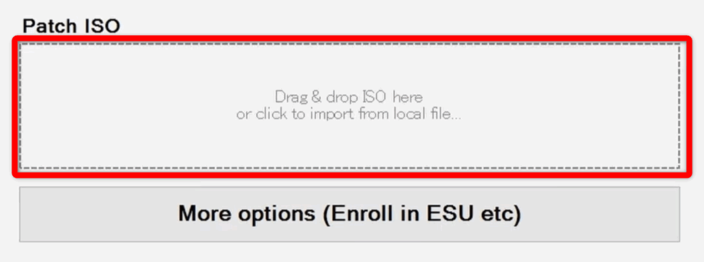 - 「Patch ISO」の下の「Drag & drop ISO here」をクリックする