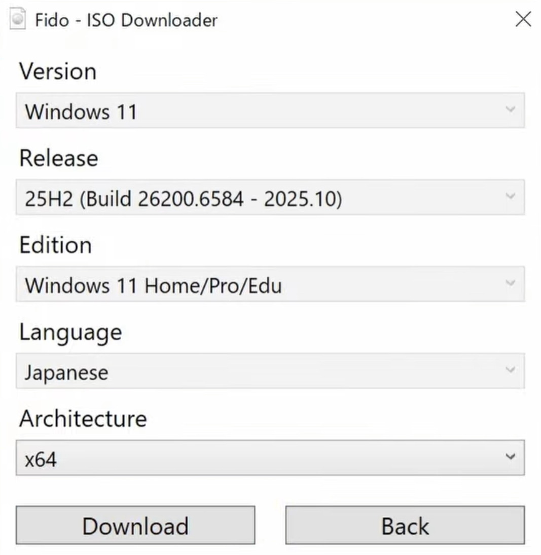 - 「Version:Windows11、Release:25H2、Edition:Windows11 Home/Pro/Edu、Language:Japanese、Architecture:x64」を選択する