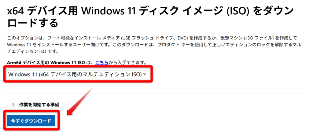 「ダウンロードを選択」→「Windows 11 (x64 デバイス用のマルチエディション ISO)」→「今すぐダウンロード」をクリックする