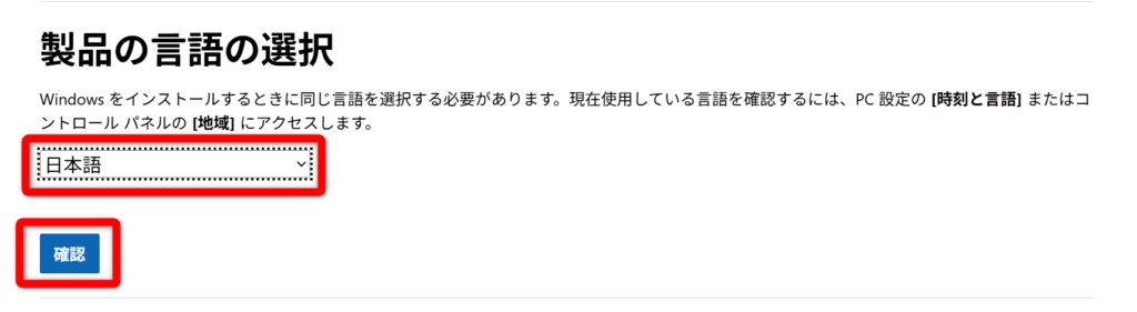 製品の言語の選択→「いずれかを選択してください」→「日本語」→「確認」をクリックする