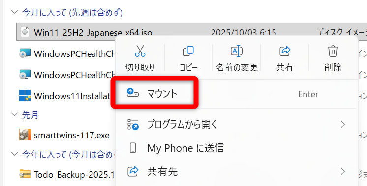 ダウンロードしたISOファイルを右クリックして「マウント」を選びます。