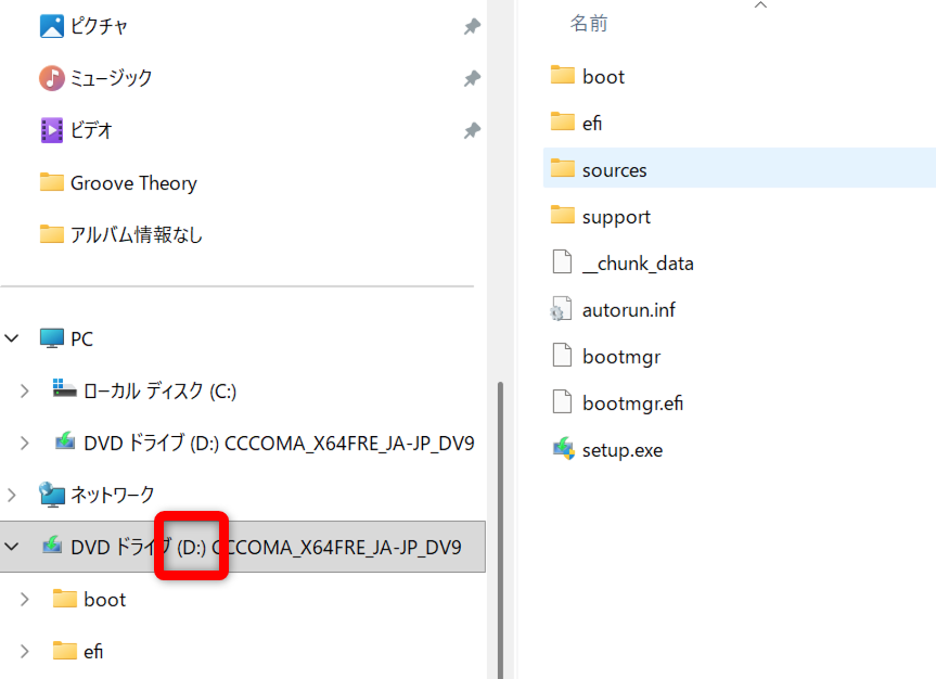 ISOをマウントしたドライブのアルファベット(例:D:)を確認したら、以下のコマンドを入力します。