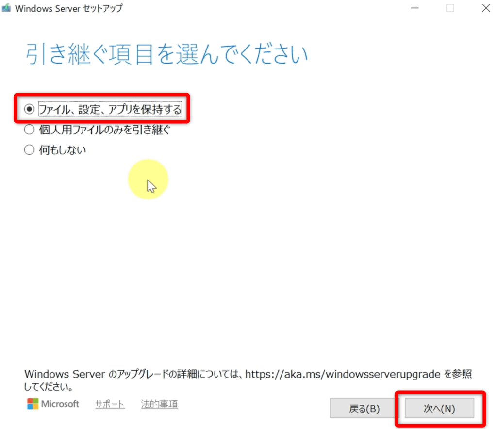 「引き継ぐ項目を選ぶ」で「ファイル、設定、アプリを保持する」→「次へ」をクリックする