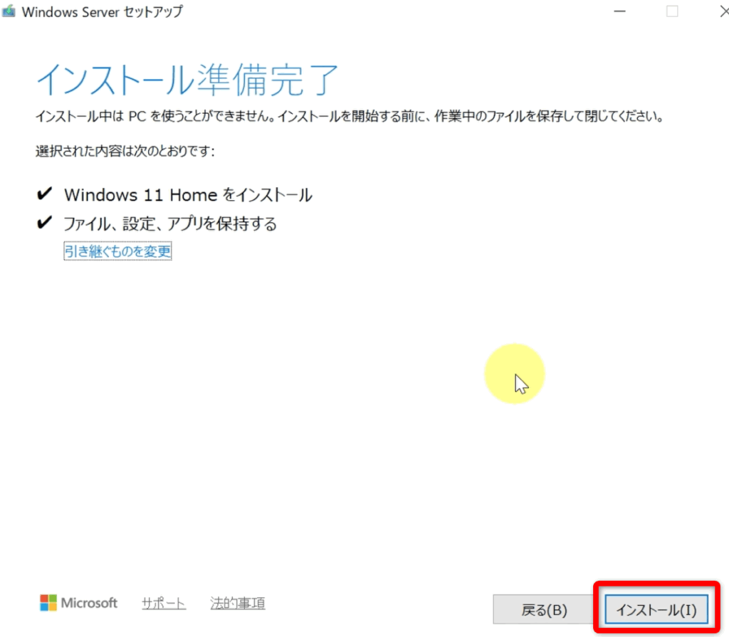 Enterキーを押すと、Windowsのセットアップが起動します。通常なら要件チェックで止まるところですが、この方法ではそのまま進みます。