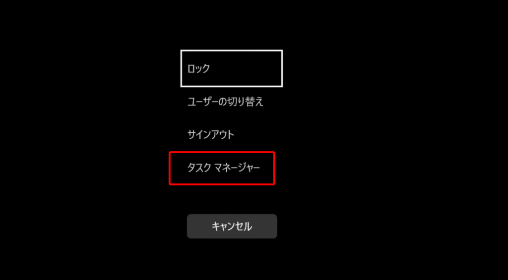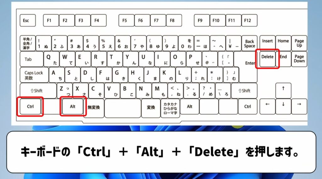 キーボードの「Ctrl + Alt + Delete」を押す。