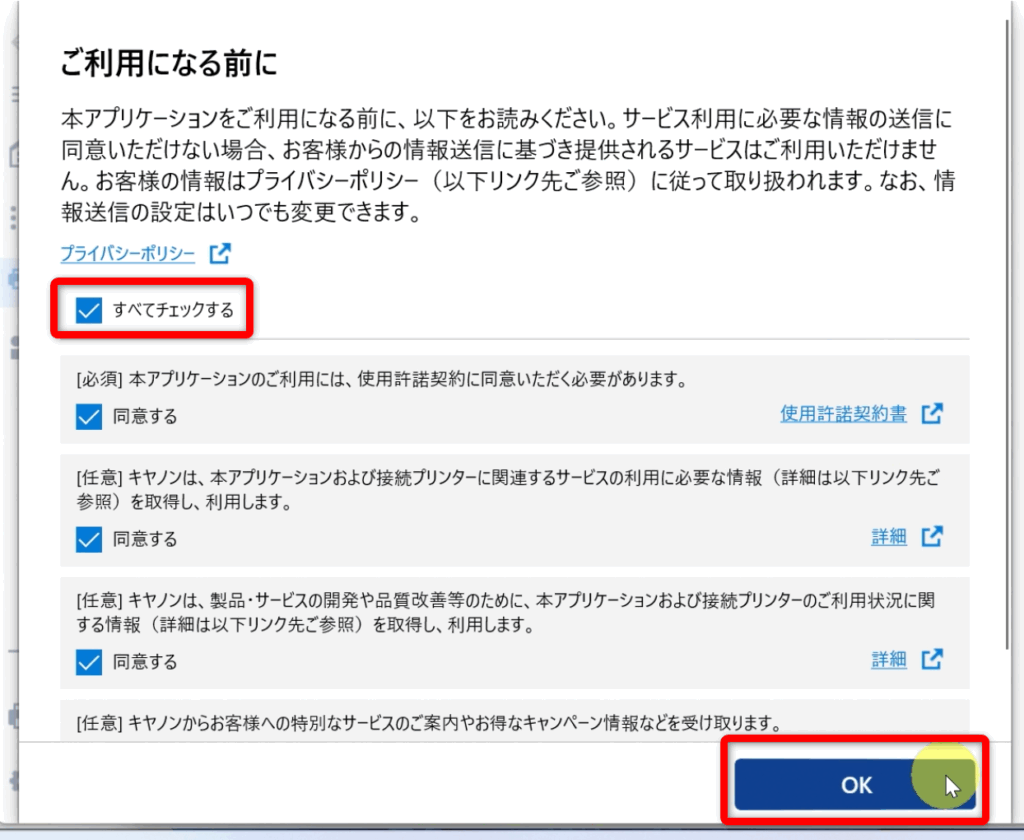 利用規約などを確認して、「すべてチェック」にレ点を入れ、「OK」をクリックする。
