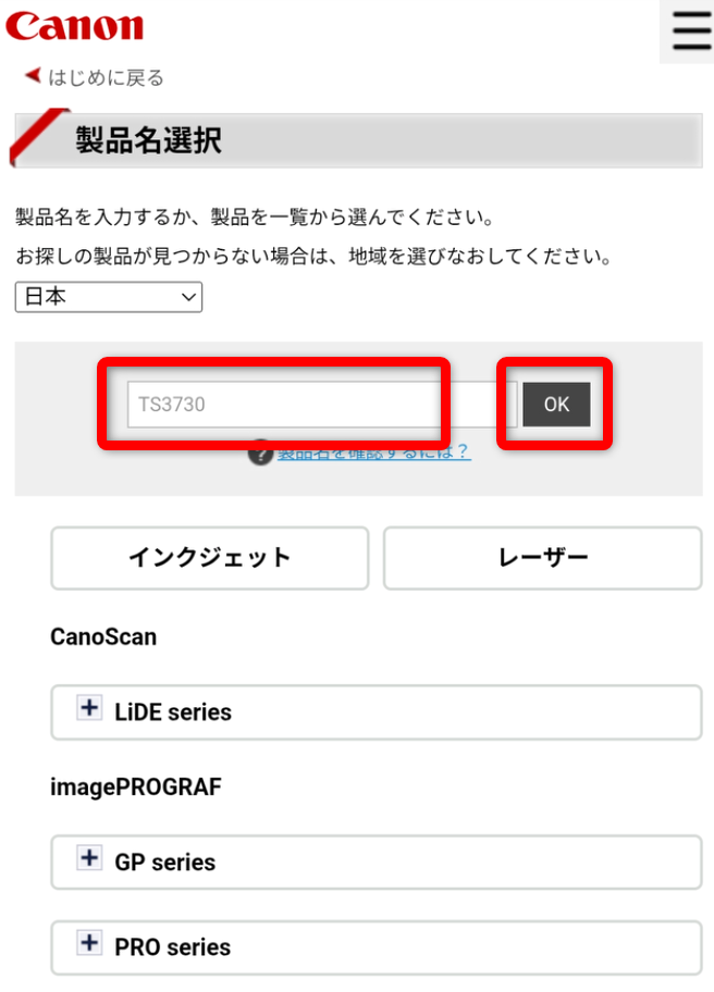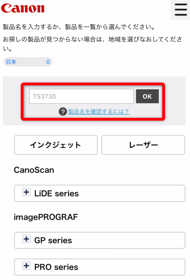 型番「TS3730」を入力して「OK」をクリックします。