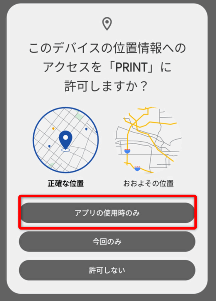 位置情報や通知などのアクセス許可を求められたら、「アプリの使用時のみ許可」でOKです。