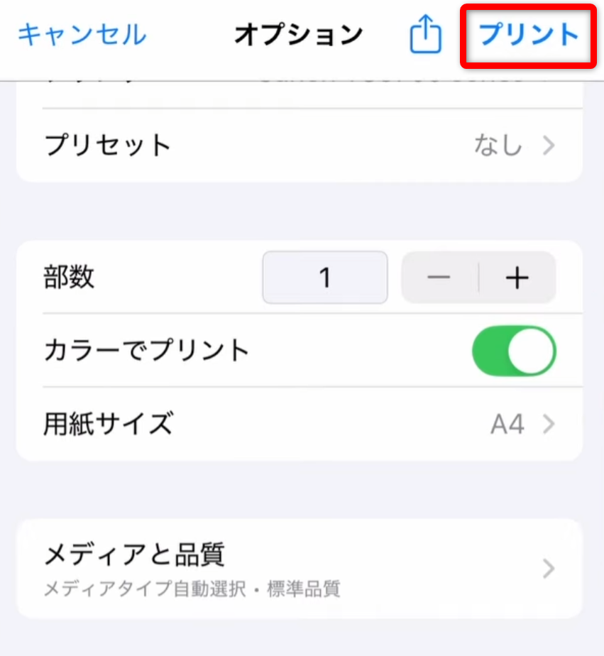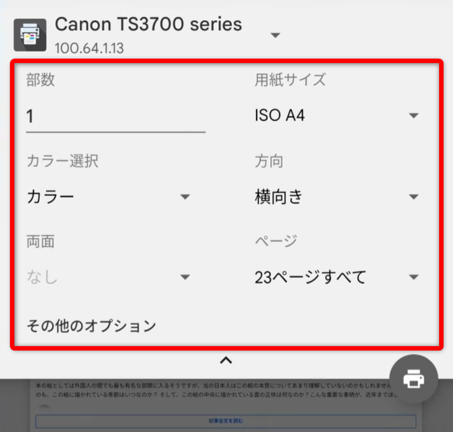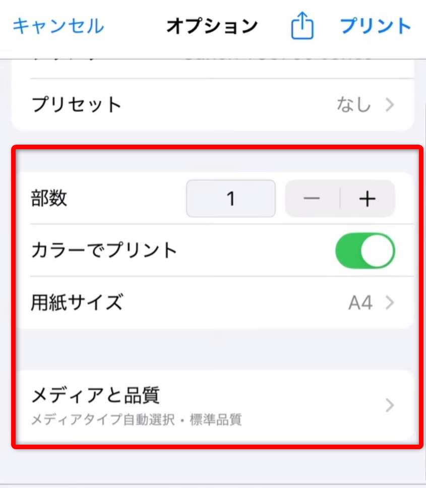 ※部数、ページ範囲 、品質、サイズなどを印刷前に選択する。