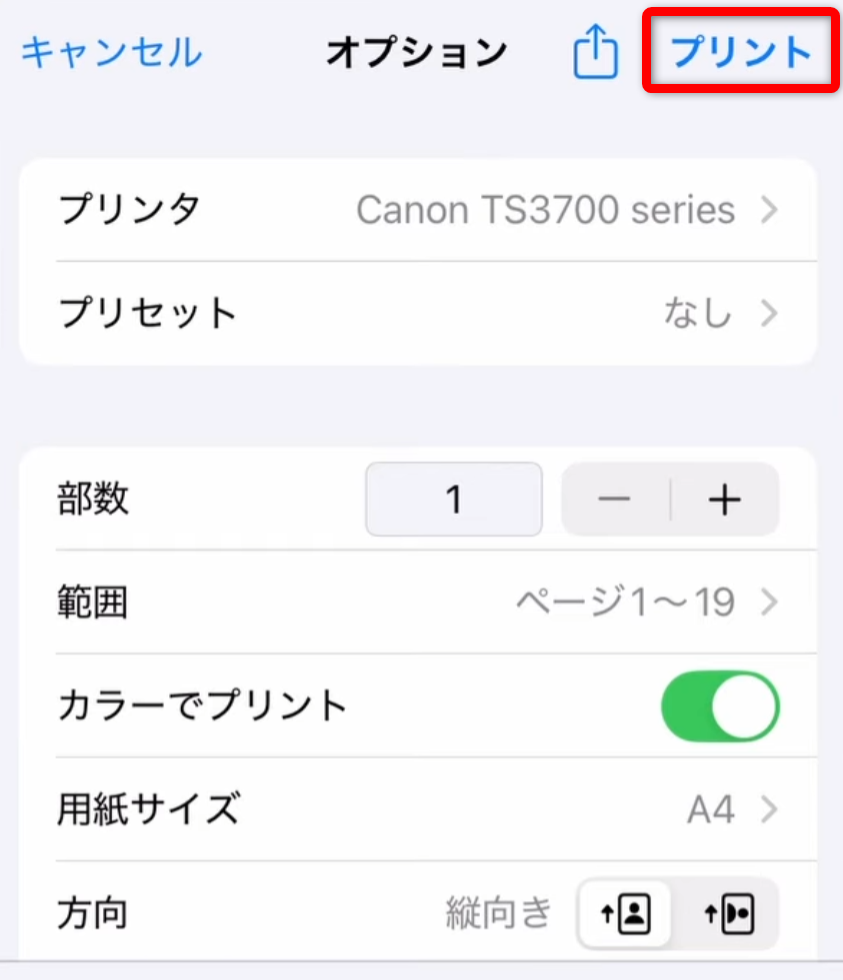 印刷設定(ページ数、向き、カラーなど)を確認する。