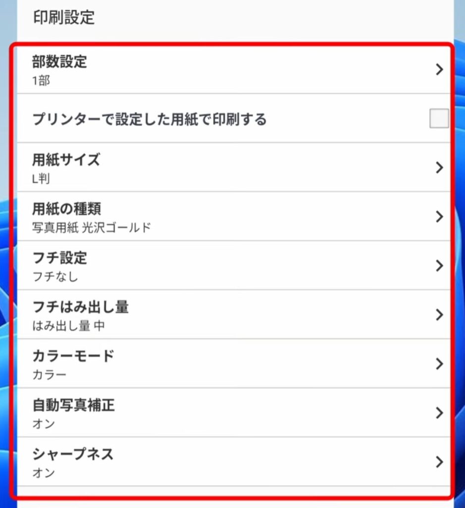 印刷設定をする。(用紙サイズ、印刷品質、フチあり/フチなし、カラー設定など)