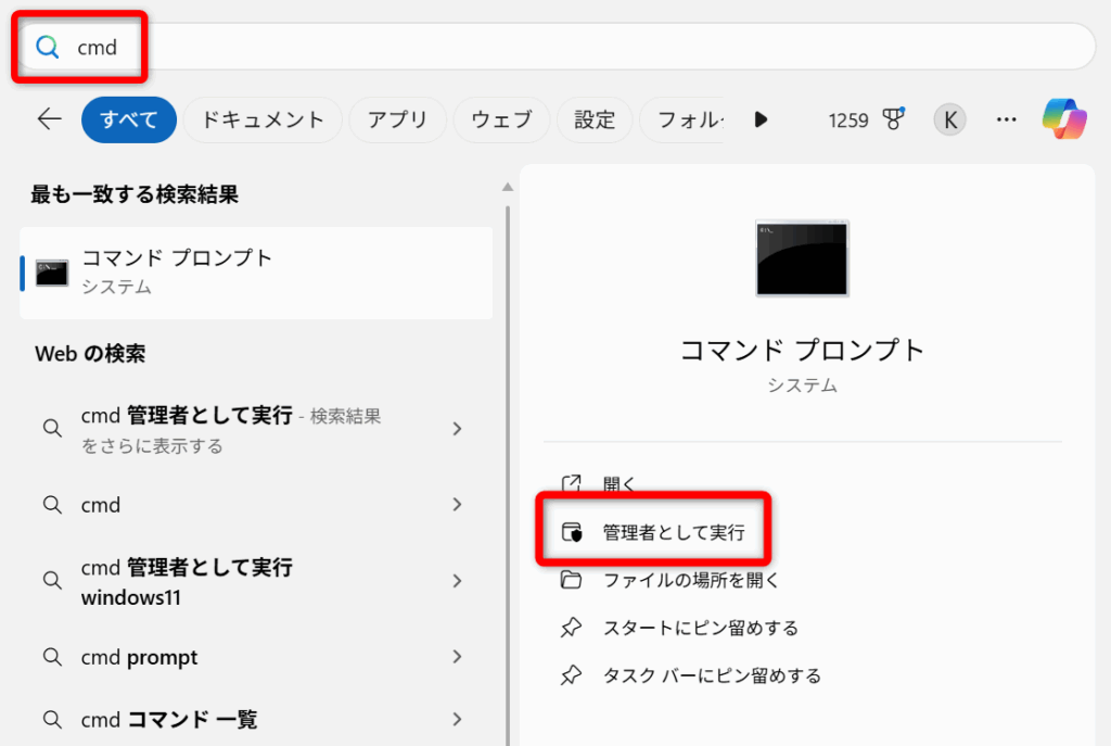 検索窓に「cmd」と入力して、「管理者として実行」をクリックする。