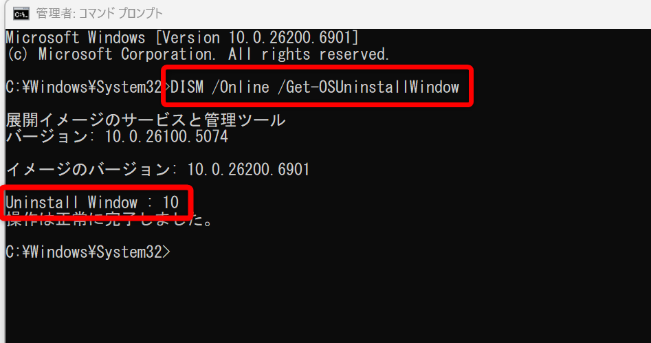 完了後、再度「/Get-OSUninstallWindow」で確認してみましょう。