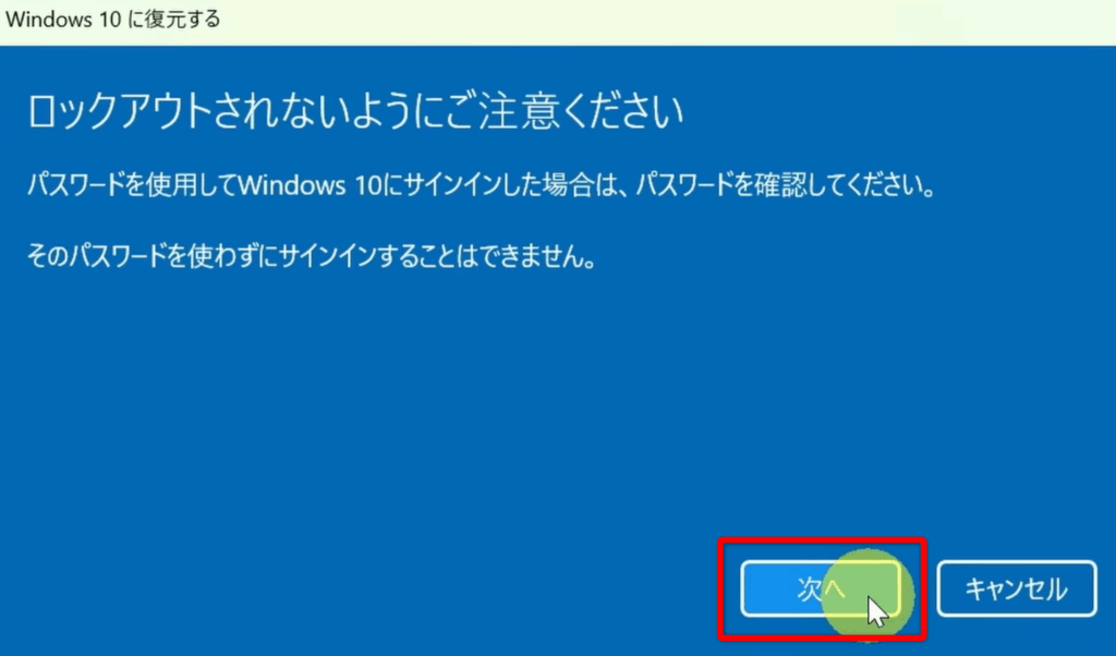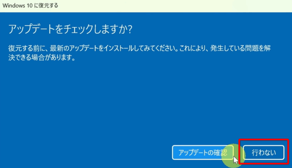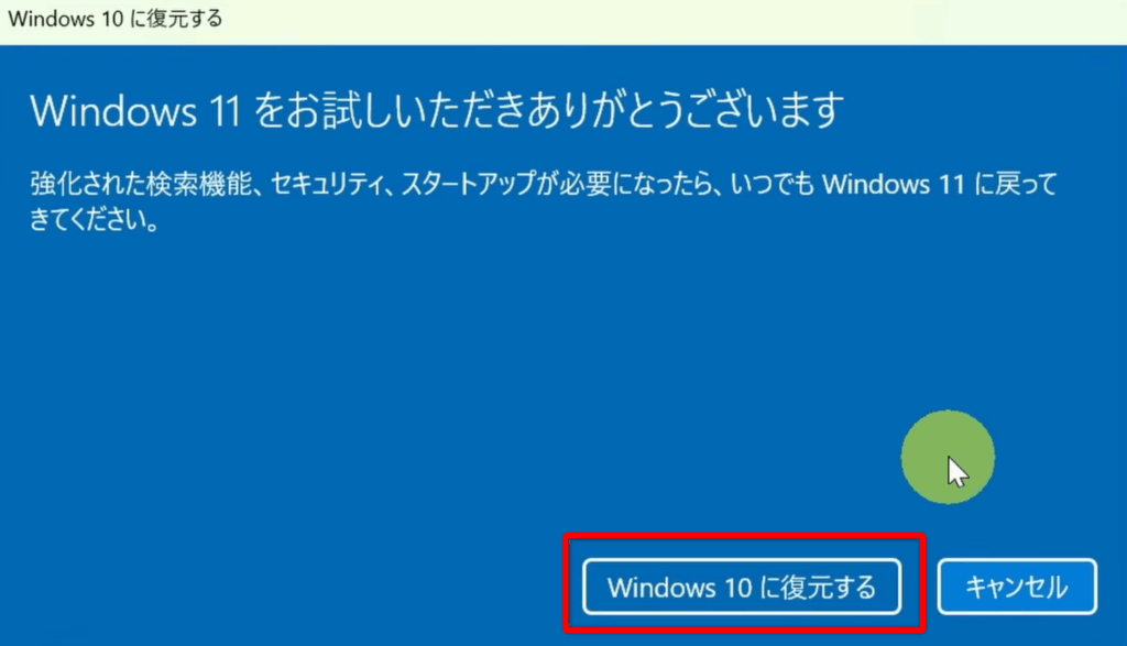 「Windows10に復元する」をクリックする