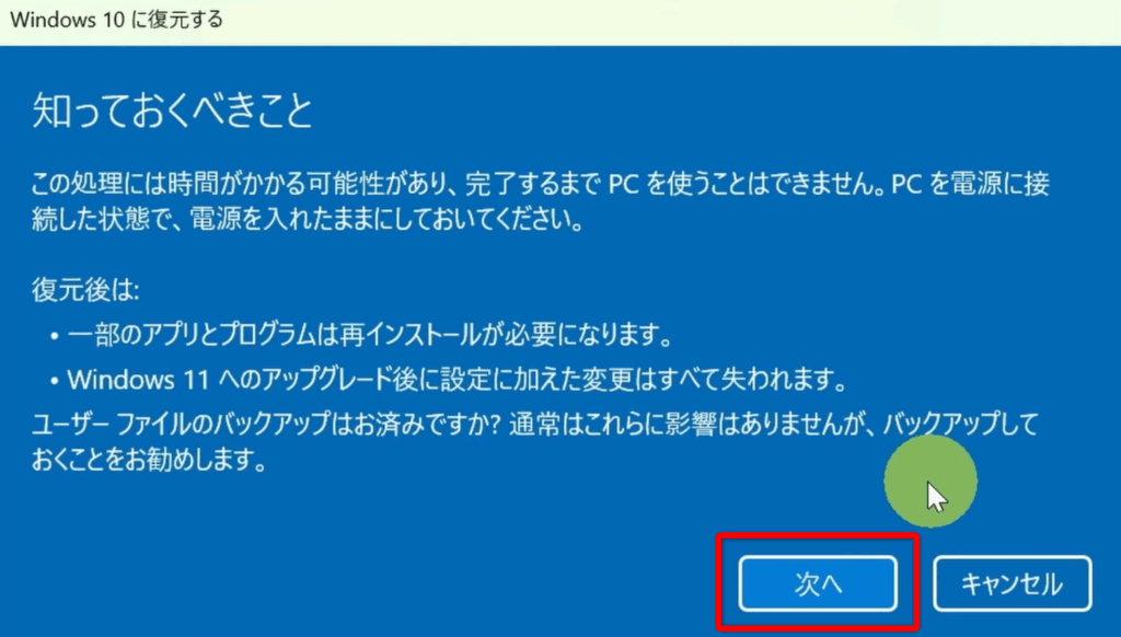 | ディスククリーンアップに注意 | 不要ファイル削除ツールで「以前のWindowsのインストール」が削除されると戻せません。 |