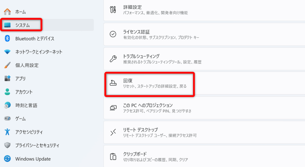 スタートメニュー → 設定 → システム → 回復 を開く